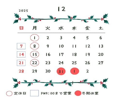 12月31日(水)・1月1日(木)元旦は休日といたします。
