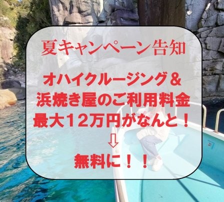 1等当選で、オハイクルージングと浜焼き屋のご利用料金が両方とも無料にさせて頂きます!