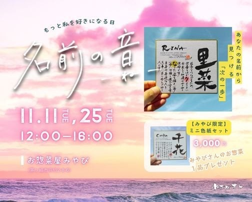 11/25(火)は茅ヶ崎・辻堂のお惣菜屋みやびさんにて名前の音企画です。