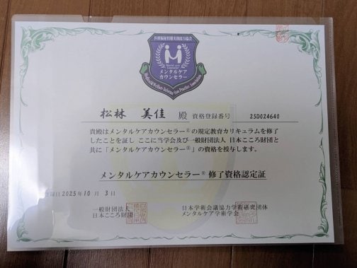 このたび「メンタルケアカウンセラー®」の資格を取得しました。