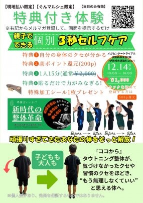 【12/14㈰ぐんマルシェ出店記念】■場所:メガセンタートライアル伊勢崎中央店2階(群馬県伊勢崎市連取町1507)■たったのコレだけで?人の身体は変わってしまう!まるで魔法にかかったみたい!と驚愕の体験ができる。メルマガ登録で下記の特典。【自分の身体のクセに合った「3秒セルフケア」体験】1人15分¥1,000 に200pという高ポイント還元。さらに、貼るだけで力がみなぎる、特殊加工のシールを1枚プレゼント!【ご利用条件】・他クーポン、チケットとの併用はできません。・体験はお一人様1回までとします。
