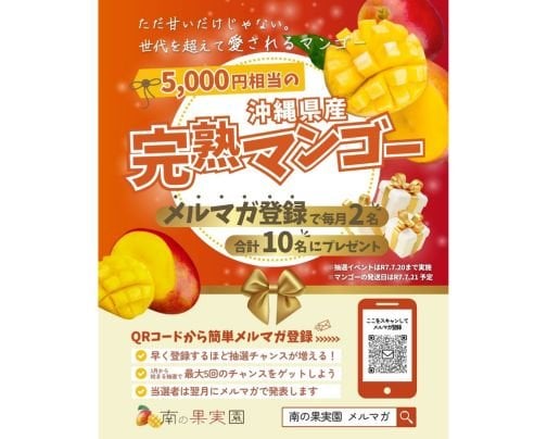 【メルマガ登録で豪華プレゼント】 南の果実園から感謝を込めて、完熟マンゴー(5,000円相当)が当たるチャンス! 3〜7月、毎月2名に当選♪ 3月から登録なら最大5回応募OK! 当選発表は翌月メルマガでお知らせ。 ぜひこの機会をお見逃しなく!