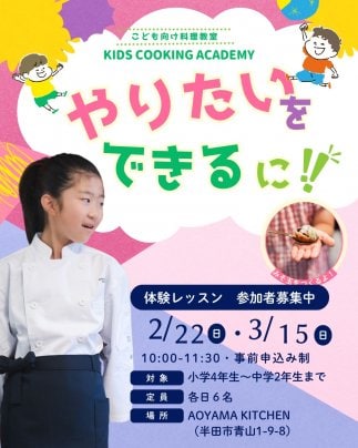 料理を通じて「やりたい」を「できる」に変える、自己肯定感や非認知能力の育成を特徴に持つKIDS COOKING ACADEMYの2期生を募集します。今回2月と3月に体験レッスンと説明会を実施します!一度見てみるだけでも大歓迎です!