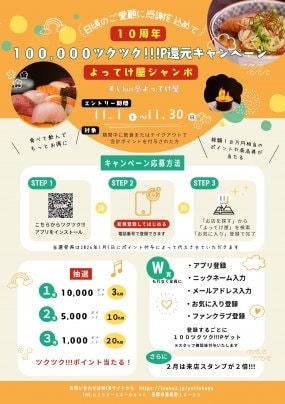 抽選で総額10万円分のツクツク!!!ポイントが当たります!期間中、ツクツク!!!アプリ登録&ご来店またはテイクアウトでポイント付与された方が対象。さらに登録時に5項目入力で各100ptずつGETのWチャンス!