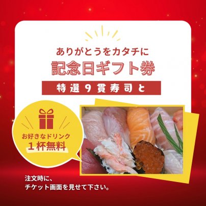 記念日ギフト券は、特選9貫寿司と1杯選べるドリンクがセットになった特別なチケットです。