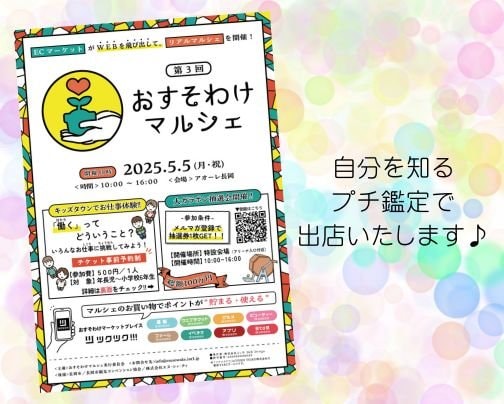 5月5日に新潟県長岡市で行われるおすそわけマルシェに出店します。「自分を知るプチ鑑定」をぜひ体験しに来てくださいね♪ …続きを読む