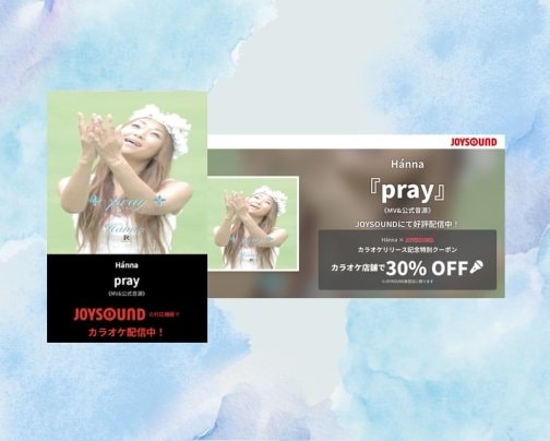 現在、カラオケJOYSOUNDにて本人映像&オリジナル音源で配信中の「pray」をぜひ歌ってね!ということで、Hánna×JOYSOUND による特別クーポン配布中です。