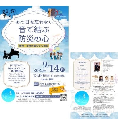 9月14日(日)13時〜アクリエひめじ中ホールにて「阪神淡路大震災から30年 音で結ぶ防災の心」を開催します。