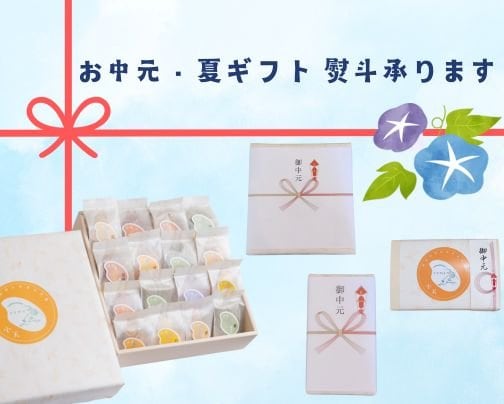 お中元は詰め合わせ・クッキー缶で対応させていただきております。