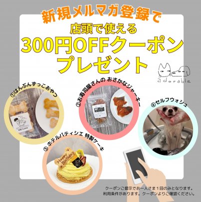 adorableメルマガ登録をすると店頭ですぐに使える300円offクーポンをプレゼント!! 家族みんなで食べられる自然派フードのadorableから不定期で届くadorableからのメールマガジン。お得なクーポン情報も配信!!お楽しみに♪