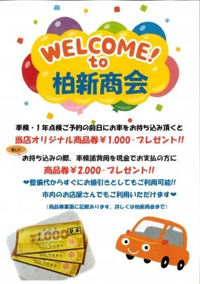 柏新商会では、車検・1年点検ご予約の前日にお車をお持込みいただくと、当店オリジナル商品券¥1,000-プレゼント!!💓