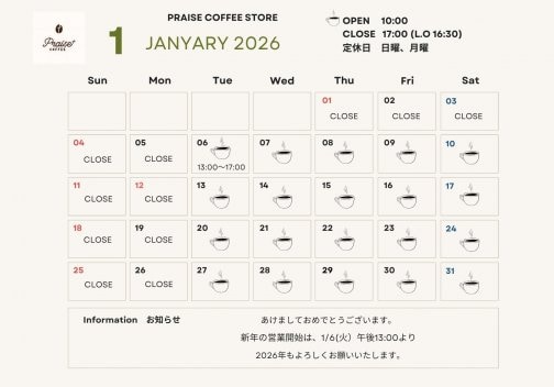 本年もPRAISE COFFEE STOREをどうぞよろしくお願いいたします。