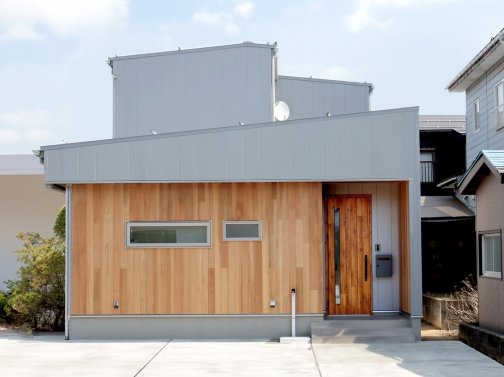 ナチュラルな木目とガルバリウム鋼板の外壁が美しく調和した、洗練された住宅です。片流れ屋根のシルエットが印象的で、シンプルながらも個性の光る外観です。外壁に使用された無垢材が、温かみと上質感を演出。プライバシーを守りながらも、自然光を取り込む横長の窓が特徴です。 …続きを読む