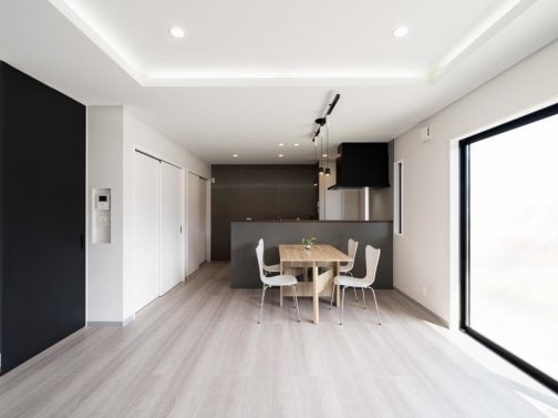 大きな窓から柔らかな自然光が差し込む、明るく開放感のあるダイニングキッチン。無駄を省いたシンプルモダンなデザインで、白を基調とした内装に木目のテーブルが温かみを添えています。ブラックのアクセントが空間を引き締め、洗練された印象を与えます。機能性とデザイン性を両立した心地よい暮らしの場です。 …続きを読む