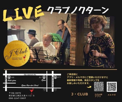 江東区大島のミュージックバー J・CLUBです。 新生JCLUBが今年4月に発足しました。 早、半年が経とうとしています。 LIVEの数も増え10月は7回企画しました。 これからどんどん音楽イベント情報をご提供します。 またお酒の情報も流しますのでどうぞご期待ください。
