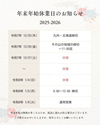 休業期間中にいただいたお問合せについては、2026年1月5日(月)以降に順次回答させていただきます。
