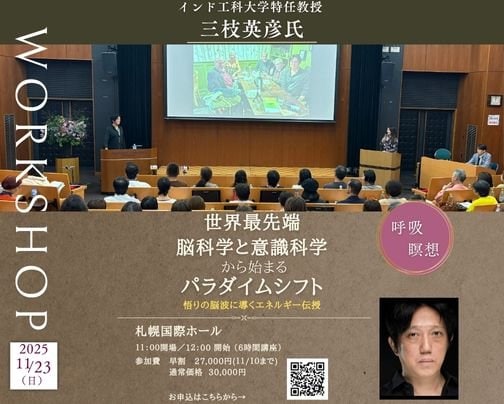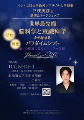 スペインバロセロナでの意識科学の学会の主催者として大成功を収められた三枝英彦教授にご来道いただいて、世界最先端の脳科学と意識科学からの視座をもってのご講演&実践ワーク。