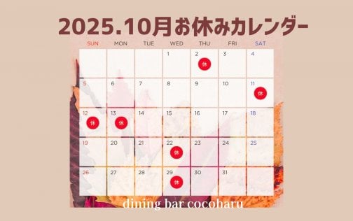 ダイニングバーココハルは10月も元気に営業いたします!そのためのお休みはカレンダーの通りです。よろしくお願いいたします。 …続きを読む