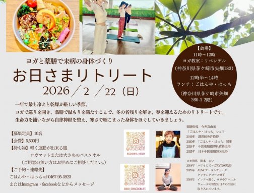茅ケ崎市にある薬膳料理のお店ごはんや・はっちさんとお日さまリトリートを行います。