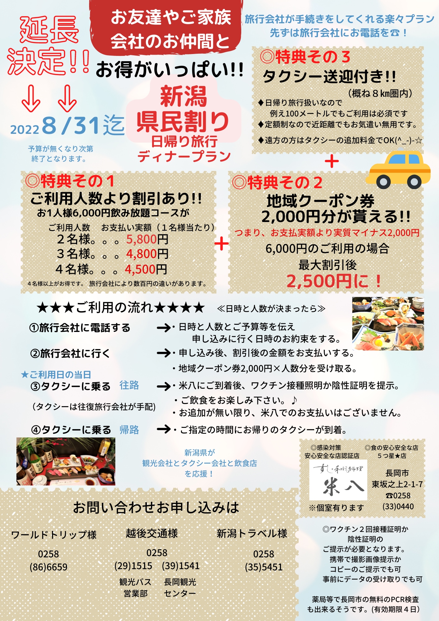 タイトルの通り新潟県民割りが8月31日迄延長になりました!!