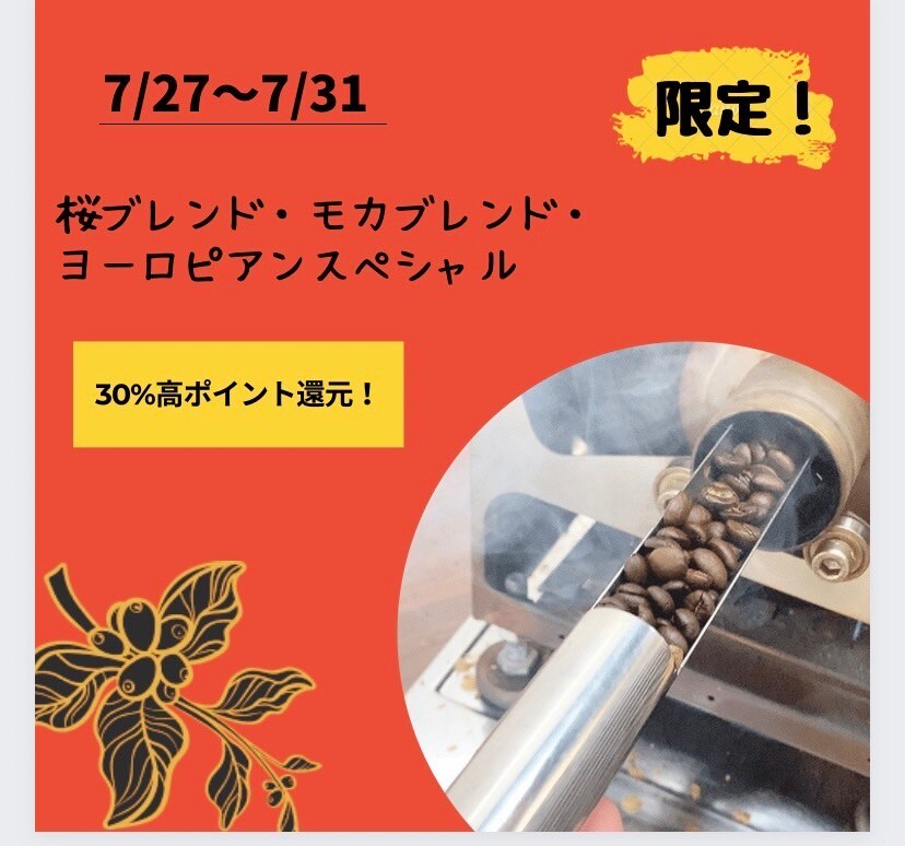 7月27日(水)〜31日(日)の期間中、通販限定(現地決済可)で人気のオリジナルブレンド3種を30%の超高ポイント還元をいたします‼︎