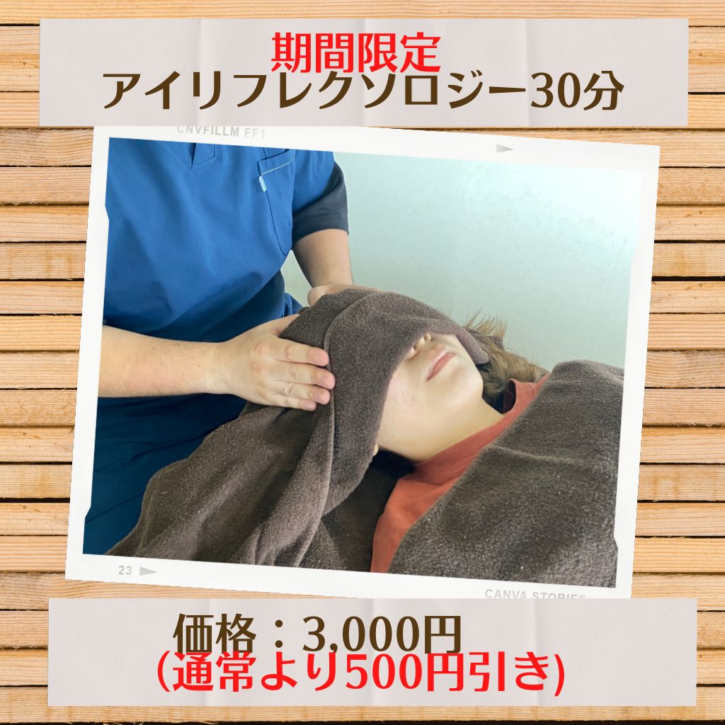 眼精疲労ケアのアイリフレクソロジー30分コースが、通常3,500円のところを500円引きの3,000円とさせていただきます。