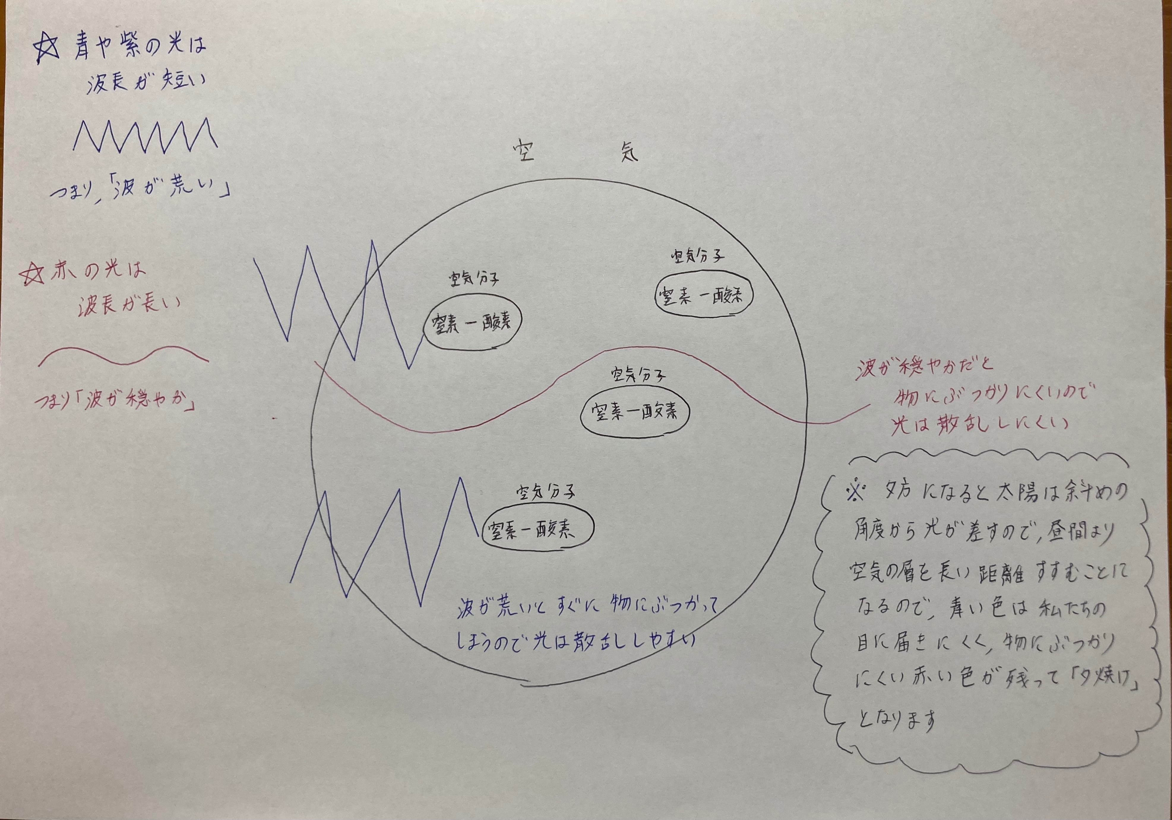 その小さな小さな分子は、太陽の光の中で短い波長(青や紫)の光を強く散乱します。