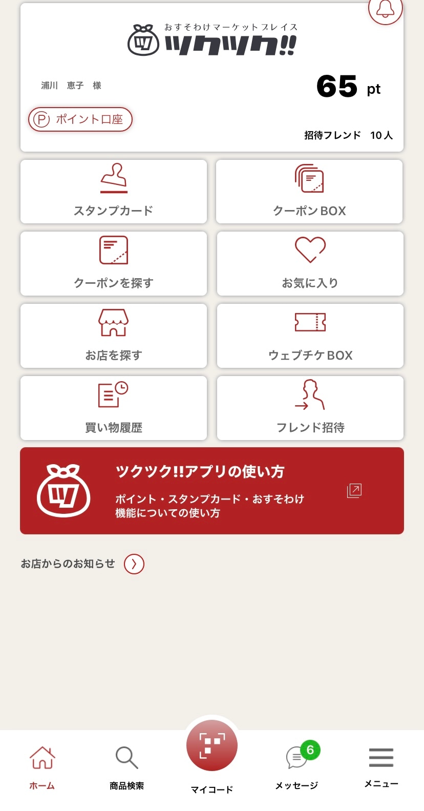貯まったポイントの確認もできますし、クーポン検索、ショップ検索、購入履歴もここで全て確認することができるようになりました。