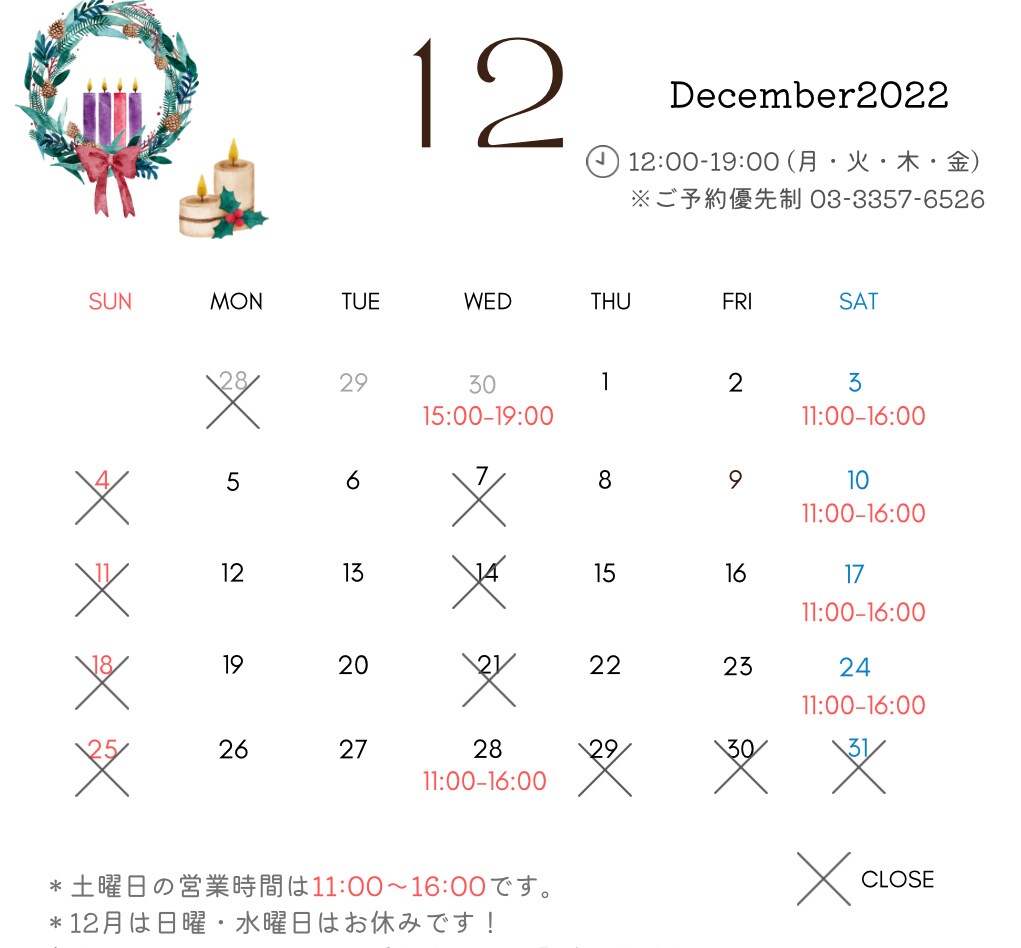 ◎11/30(水)、12/5(月)は15:00からの営業となります。