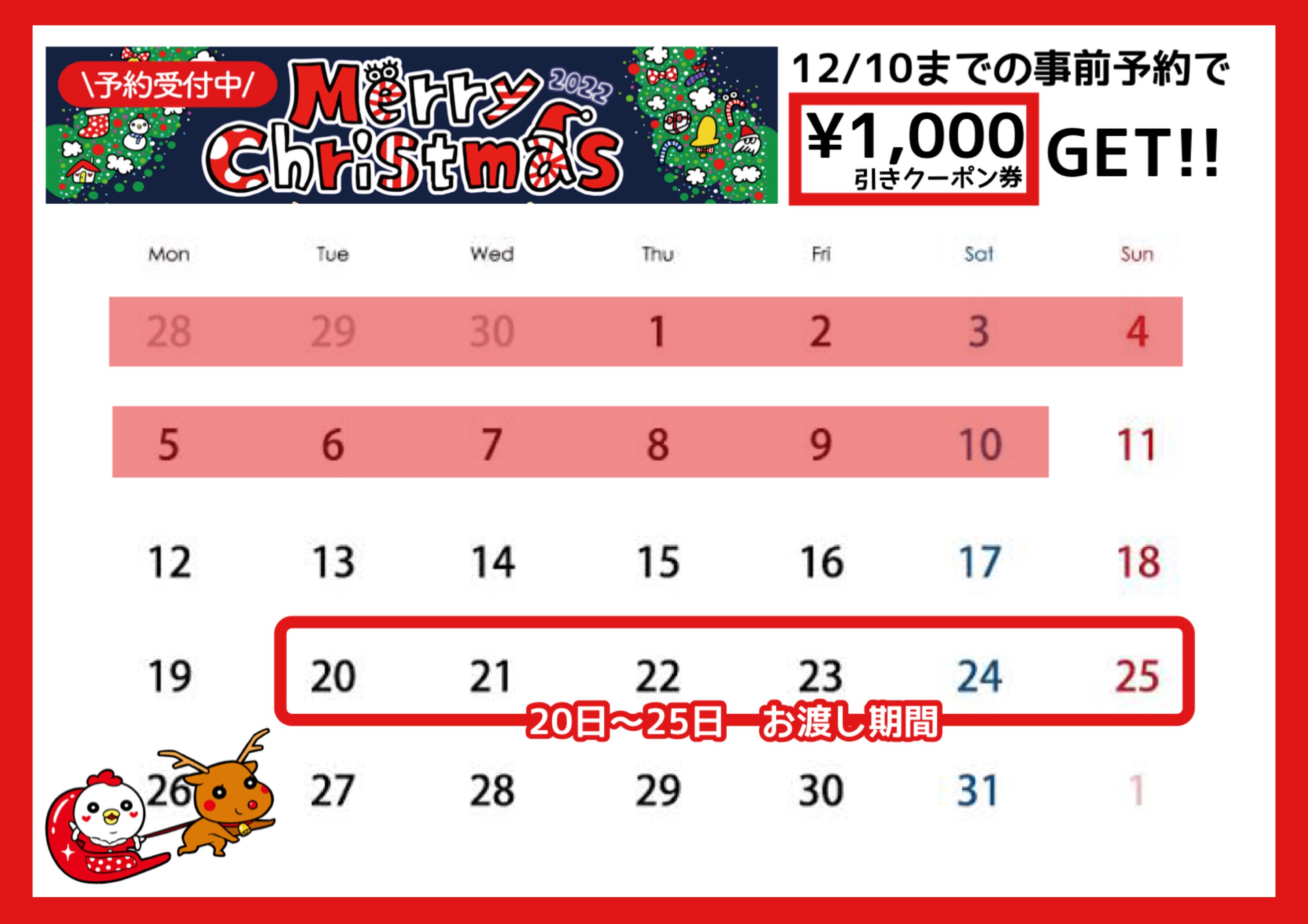 本日より、12月10日の閉店時までに【Bセット】【Cセット】をご予約いただけたお客様には、当日の商品お渡し時に、12月26日から使える1000円引きクーポン券をプレゼントいたします🤩🤩🤩