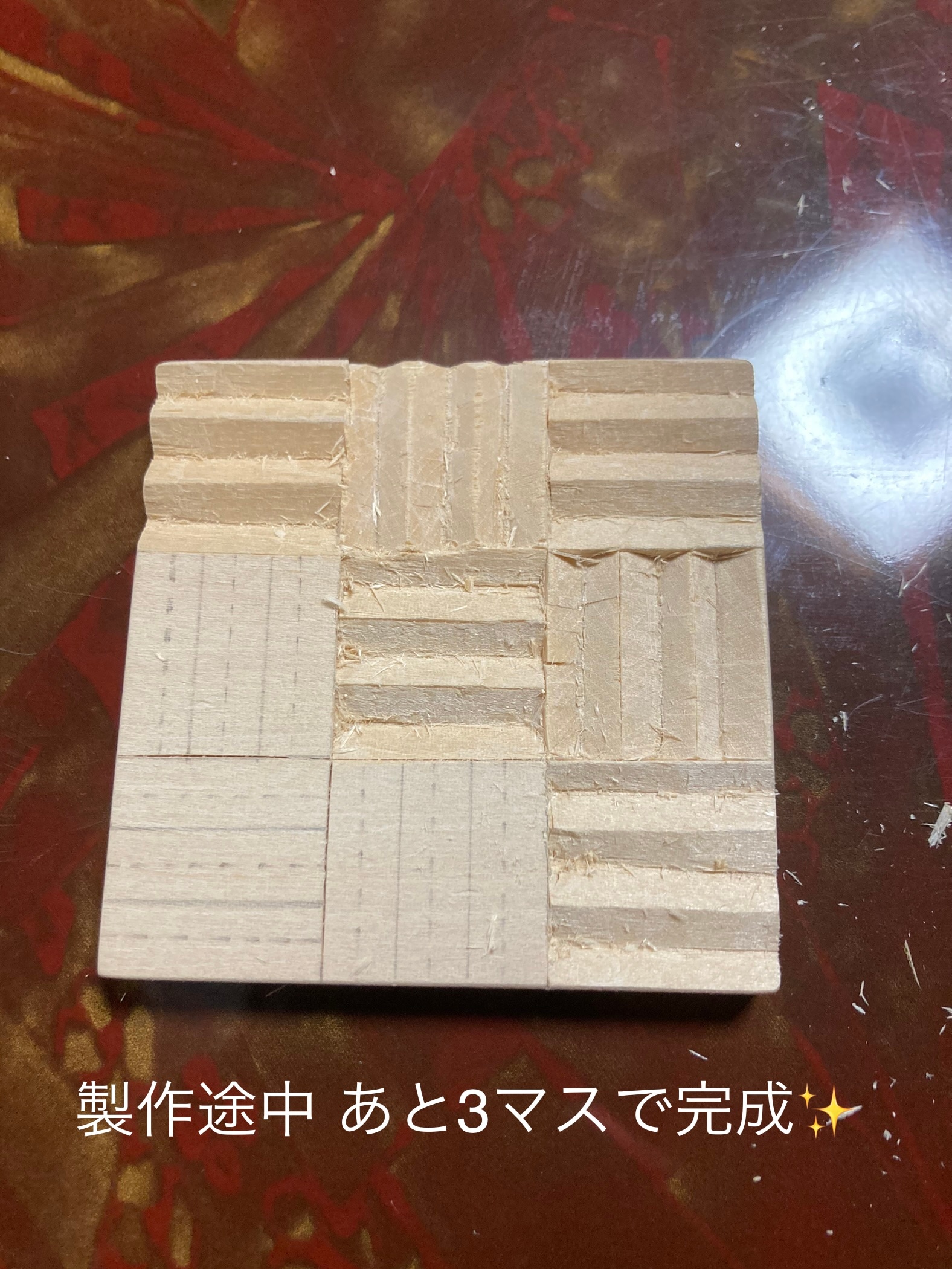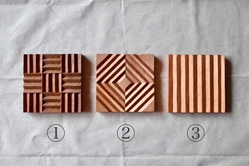 「和もようのコースター」を作るイベントで、写真の様な1.縞(しま)、2.綸子(りんず)、3.算木崩し(さんぎくずし)という3種類の模様の中から1つ選ぶ事が出来ました。
