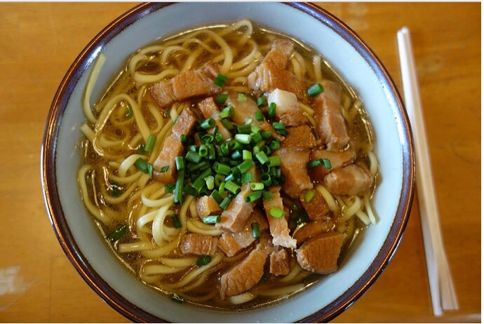 スープは豚骨のだしが主体で、ほんのり甘みのあるのが特徴で、具材には、沖縄そばが豚肉の三枚肉を使うのに対し、醤油で煮た豚の赤身肉とカマボコを細切りにして載せるのが沖縄そばとの違いだそうです。