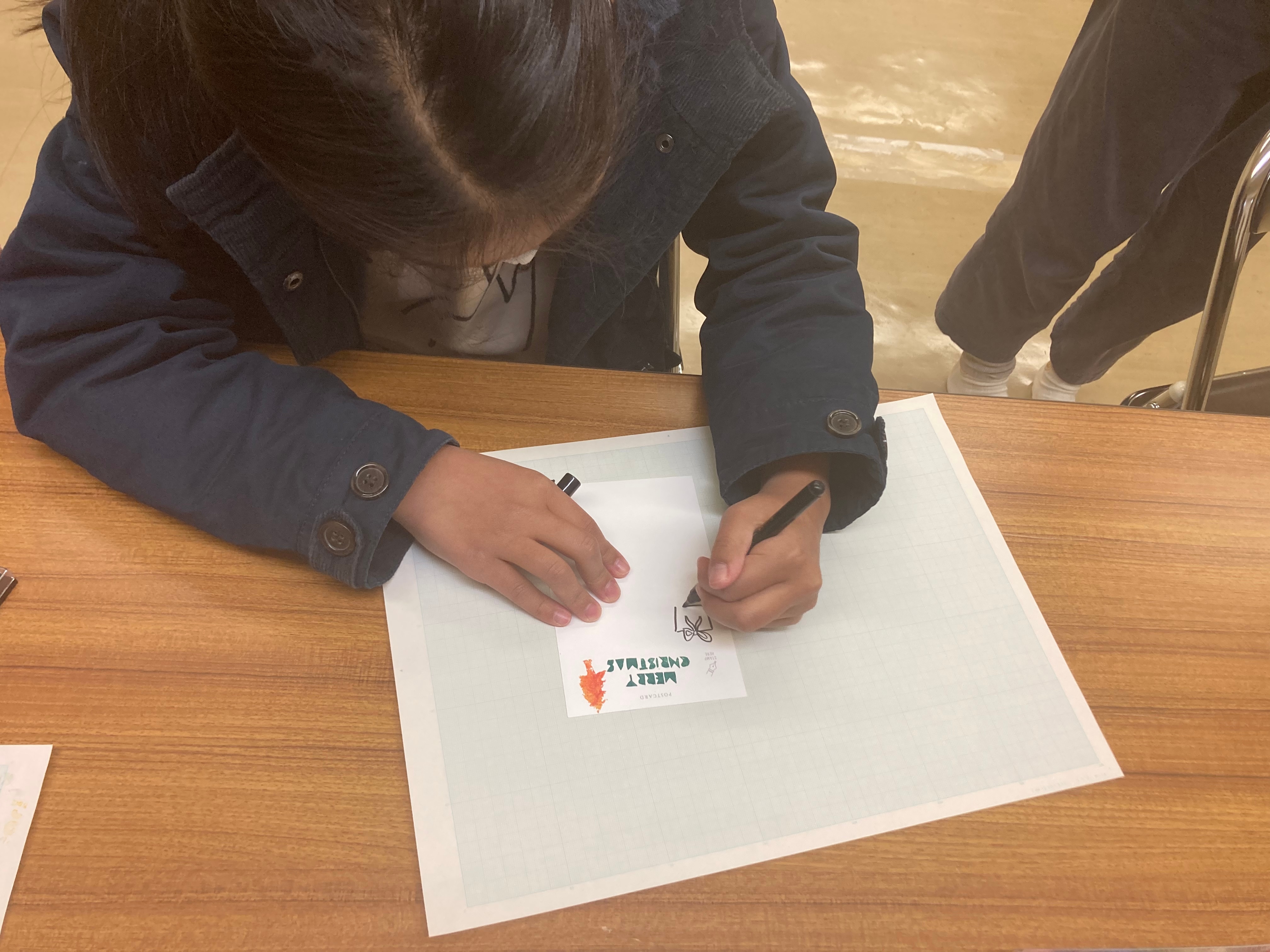 9名の子供たちがそれぞれ素敵なクリスマスリースの作品を作ってくれたり、彩土里会さんが準備をしてくださった、サツマイモで作った「芋版」を使ってクリスマスカードや年賀ハガキ作りを、親御さんと一緒に熱心に取り組まれていました。