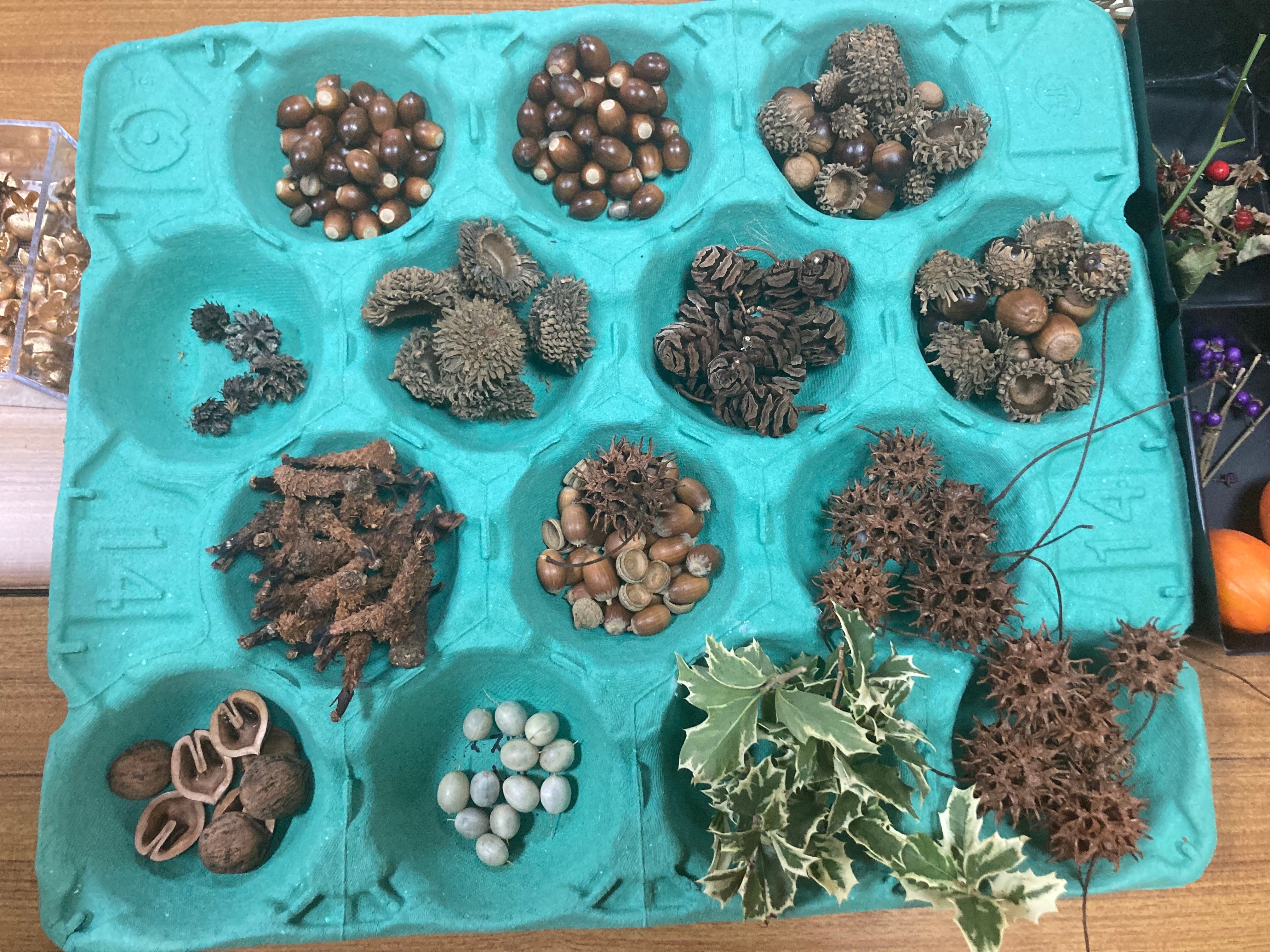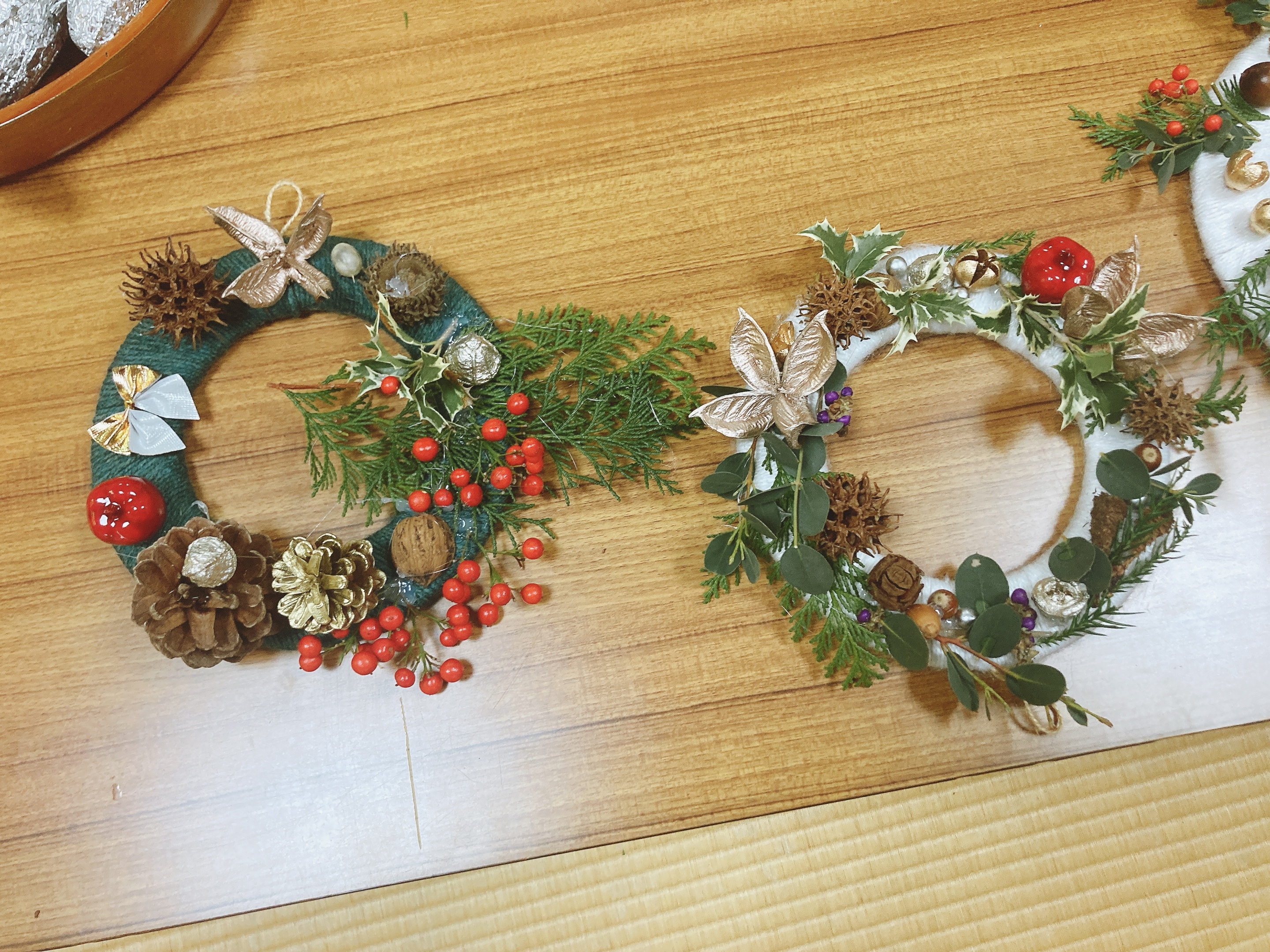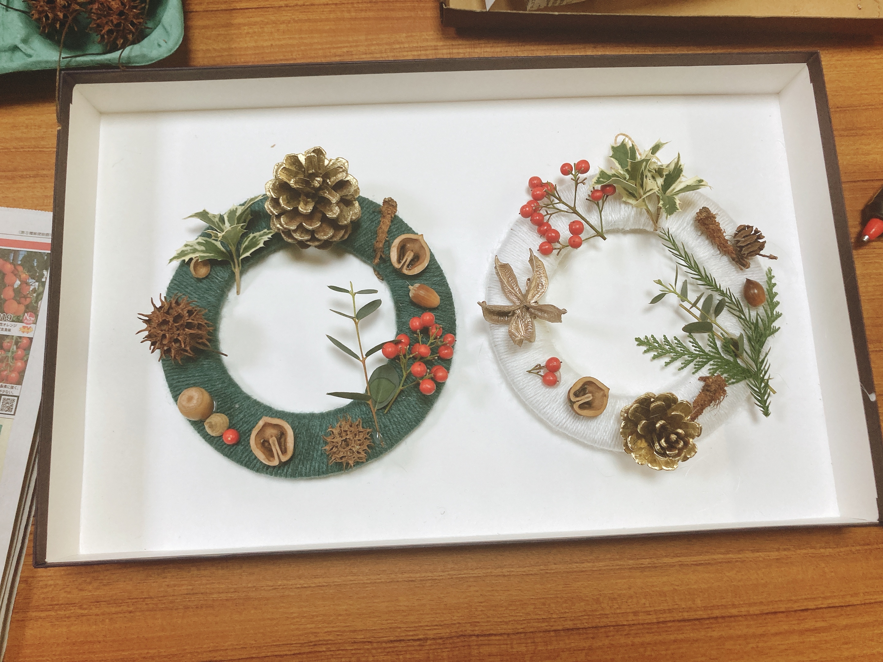 クリスマスリース作りには、彩土里会の方が色んな木の実を集めてくださり、そのお陰で皆さん、個性溢れる作品がたくさんできたと思います。木の実は私が初めて見る木の実がいっぱいで、その中にはリスが松ぼっくりを食べた後の「エビフライ」というユニークな名前の木の実もありましたよ。