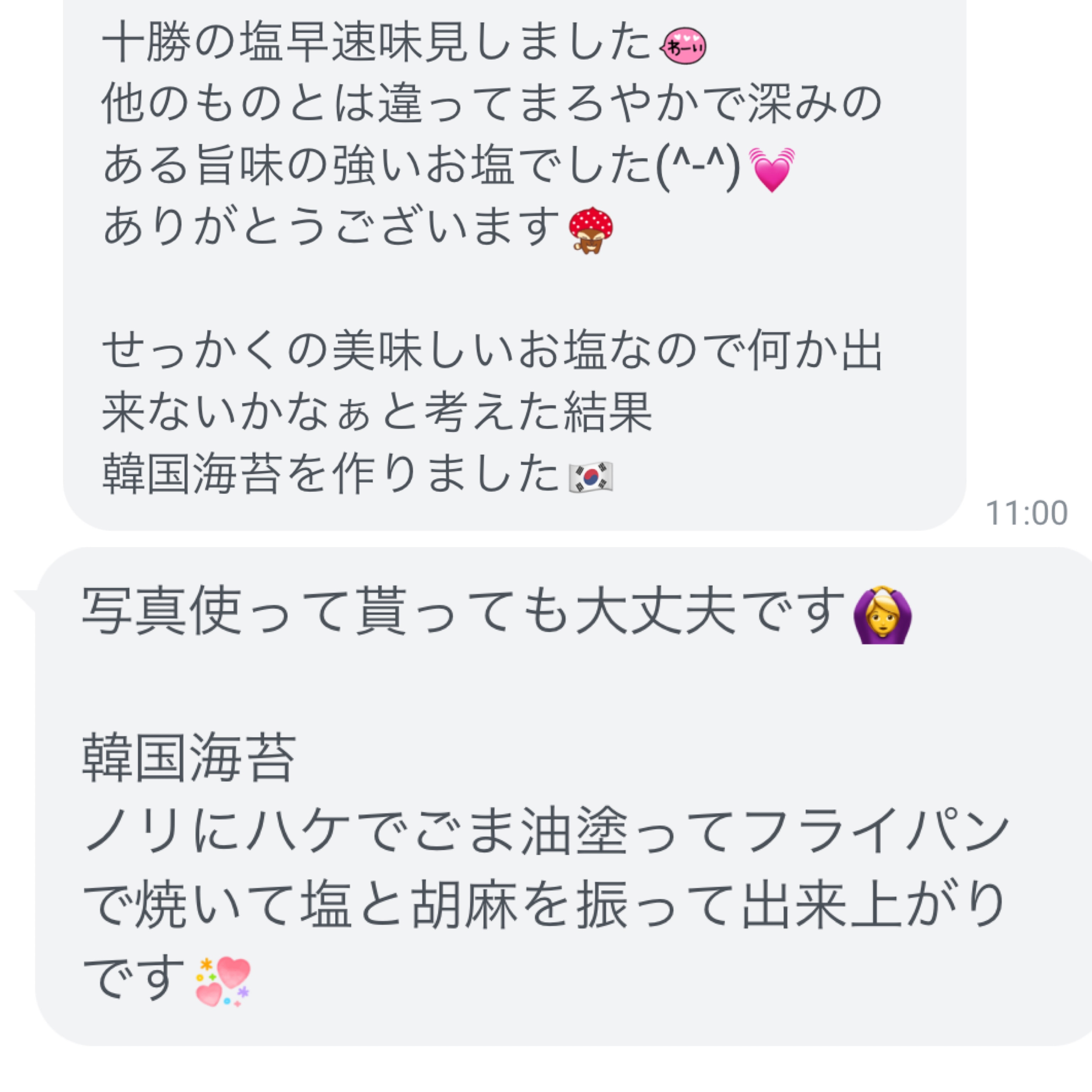 それと、塩が大好きな私。【十勝の塩】を買い、お客様と話していたら、十勝の塩で自家製韓国のりを作ったとお客様からメールを頂きました。