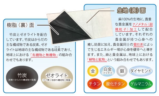 麻100%の生地に、貴重な貴金属をナノメタル(超微粒子)加工して配合しています。