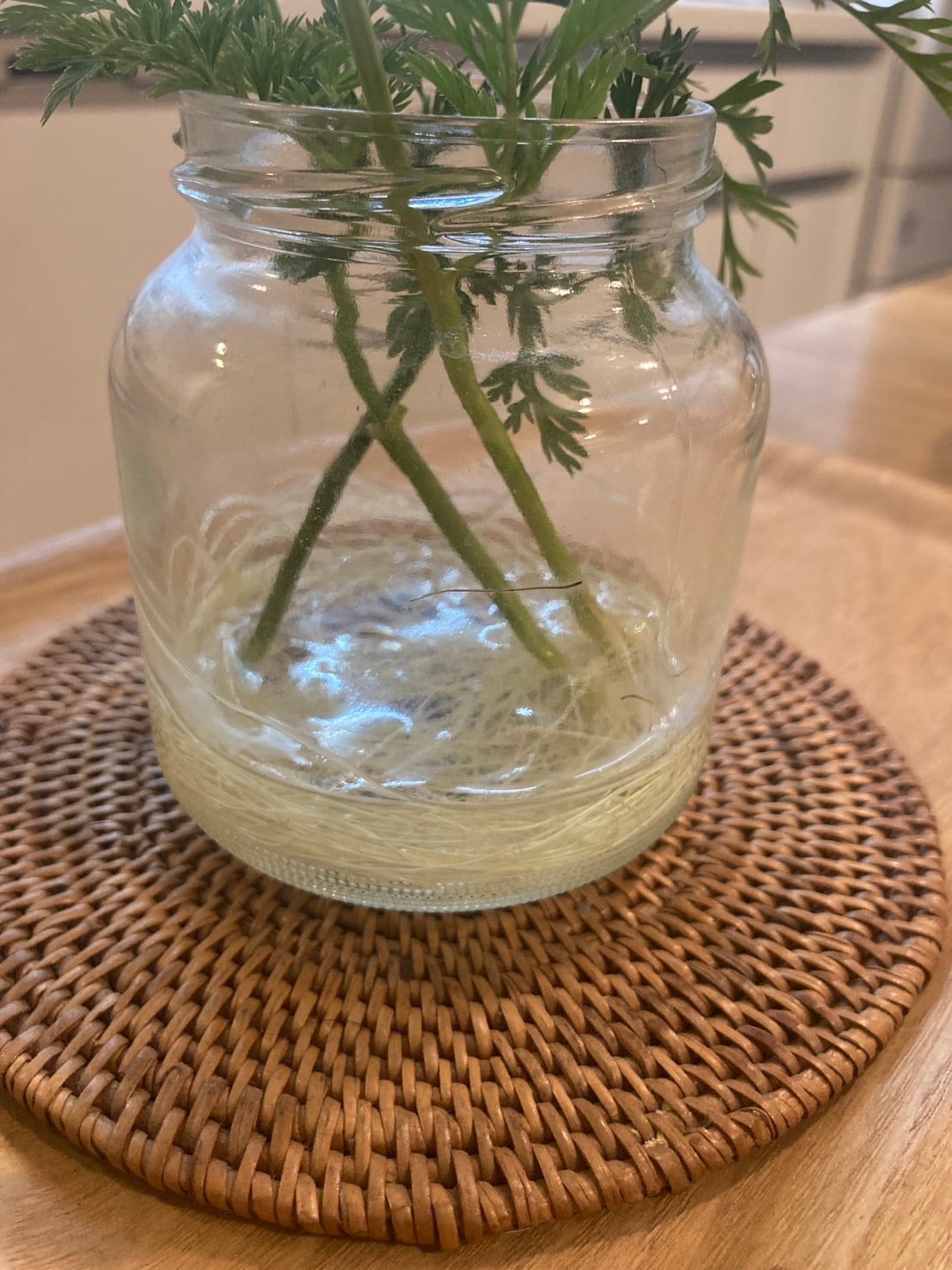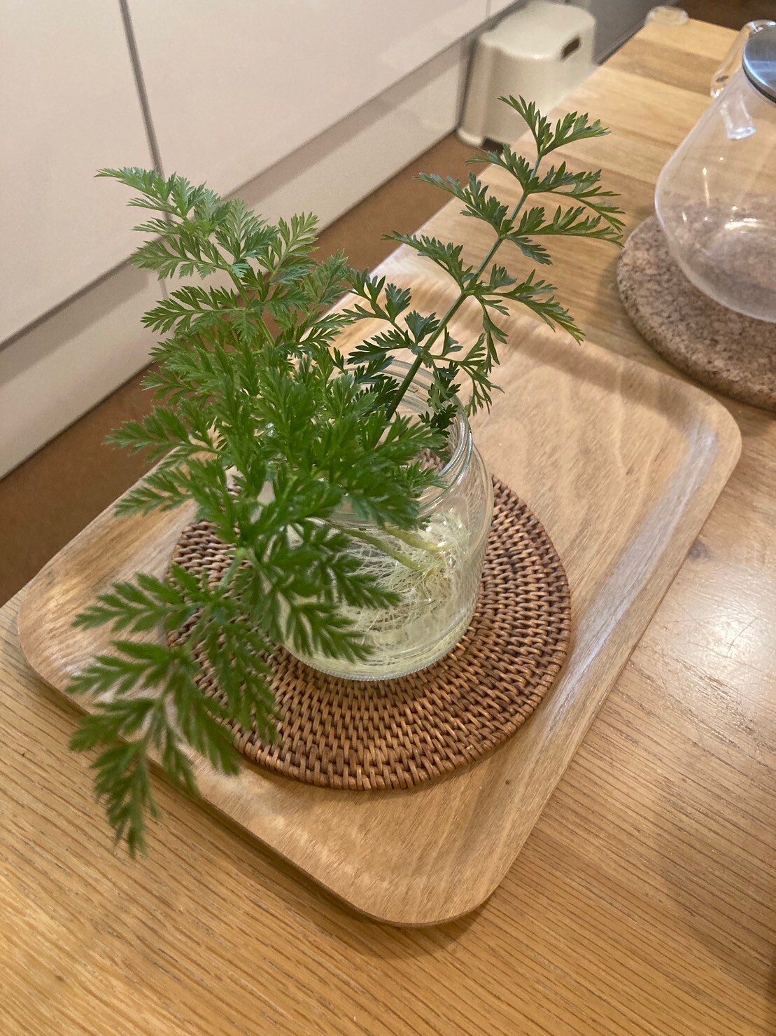 【やおやかなもり】さんが育てた人参の葉を2か月前に観賞用に瓶にいれて飾っていました。