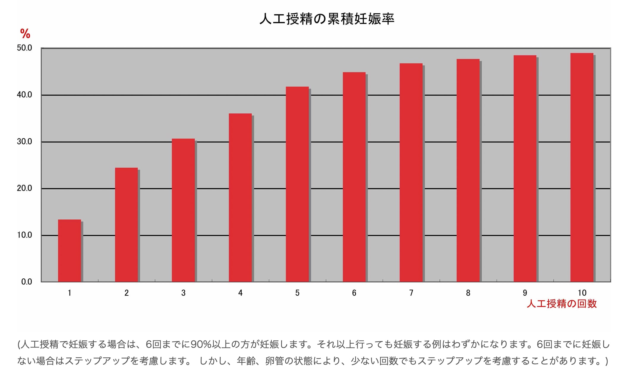 人工授精を6回以上繰り返しても結果が出ない場合はステップアップも考慮される時期かもしれません。 この表にもあるように6回目以降の妊娠率はほとんど上がりません。。。
