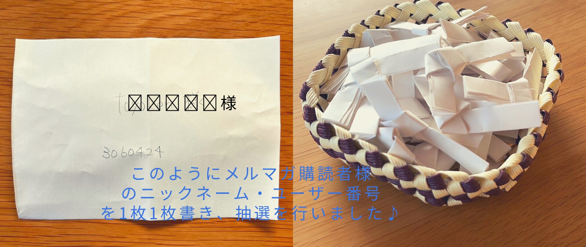 豊坂建設のメルマガを購読してくださっている方々のニックネーム/ユーザー番号を紙に書き、折りたたんで箱に入れ、そこから2枚引くという感じです。