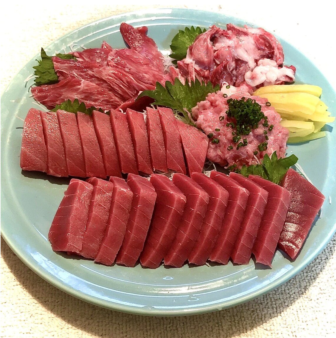 国産本マグロの赤身(約200g)・中とろ(約200g)・目玉・はちのみ・ほほ肉がついたセット。
