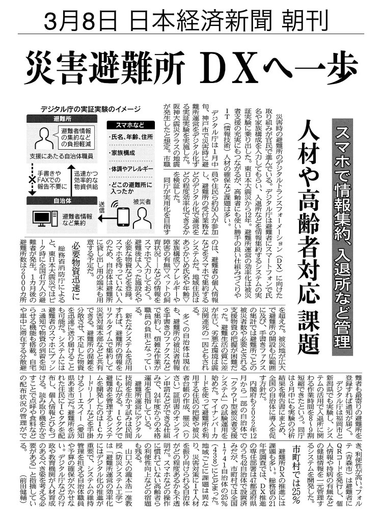 つまり、デジタル化は物理的なものを電子的なものに変換することに重点がありますが、DXはデジタル技術を活用して企業や組織のビジネスモデルを根本的に変革することに重点があります。そして、今までインターネットにつながっていなかったモノをつなぐことをIoTと言います。今日の記事は今まで繋がっていなかった「行政」と「避難所」をインターネットで繋ぎ、避難所生活における人の生活を行政が把握し、改善していくという、新しい価値を生み出だした事に関するものでした。