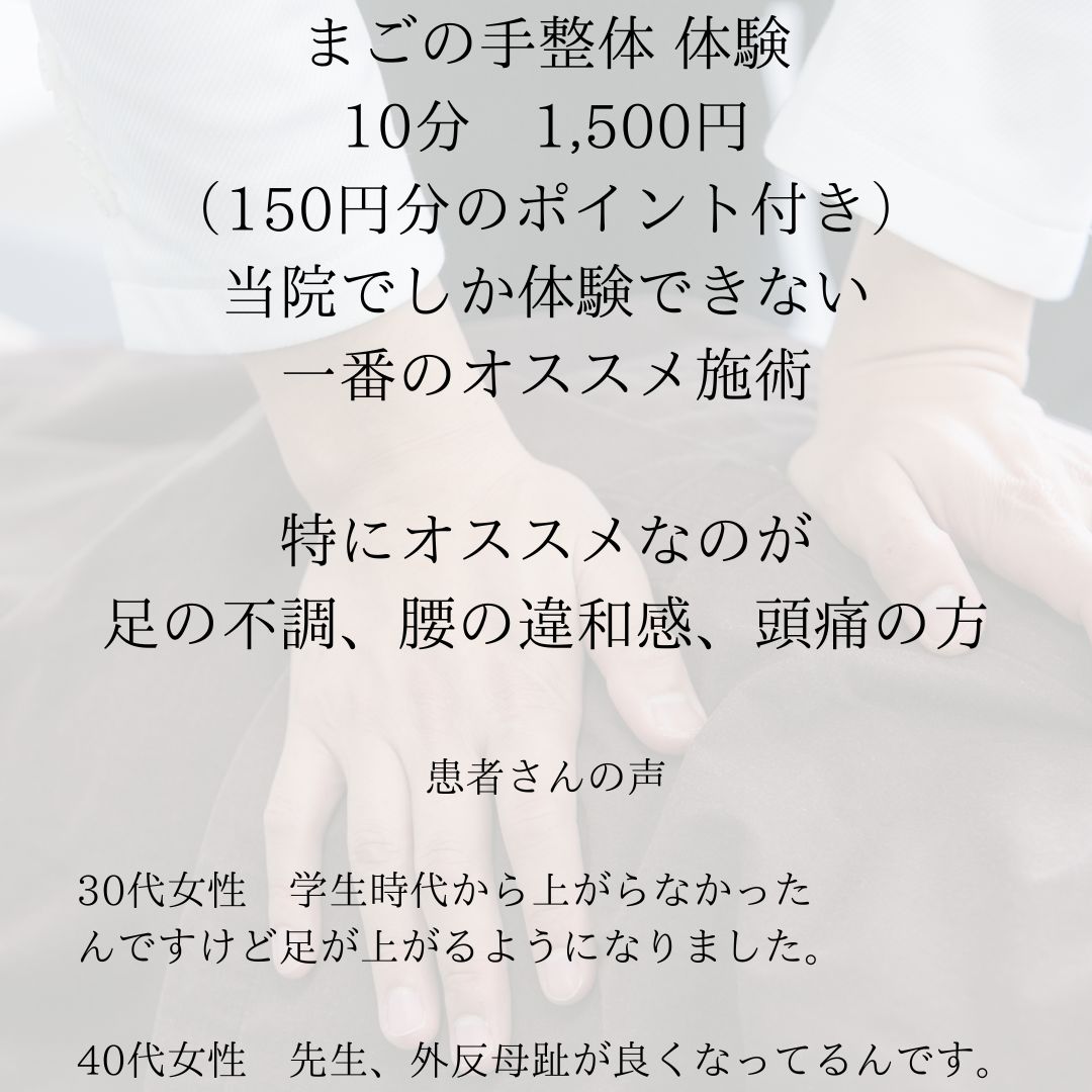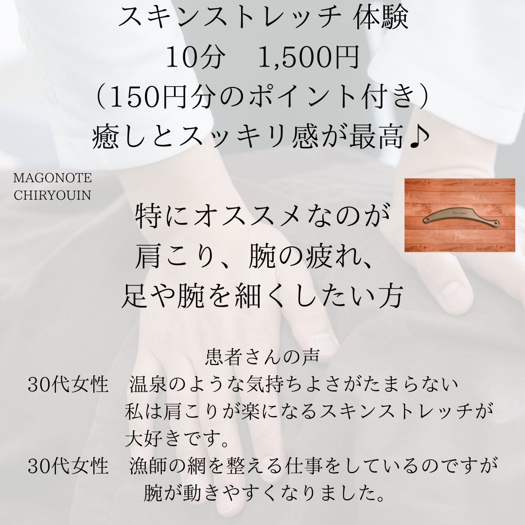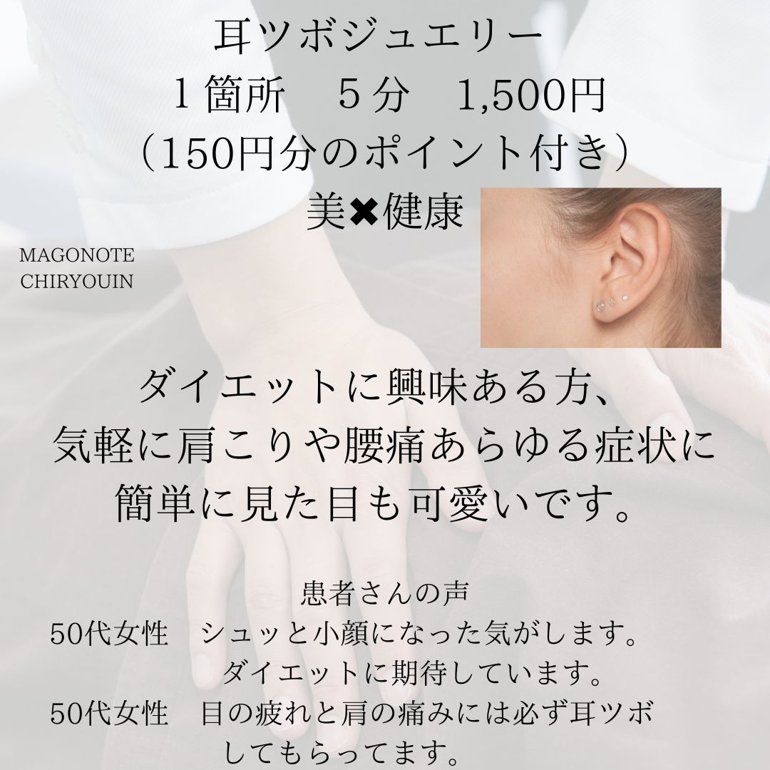 当院はまごの手整体、スキンストレッチ、耳ツボジュエリーを施術させて頂きます。