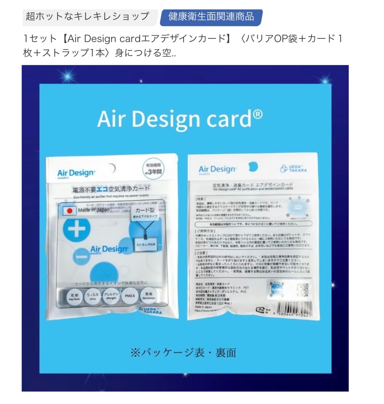 『Air design cardエアデザインカード』は、携帯に便利な身に着けるだけ・電源不要のNEWタイプの空気清浄カードです。