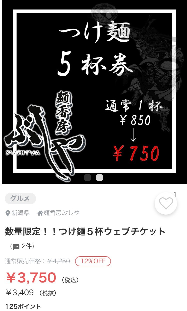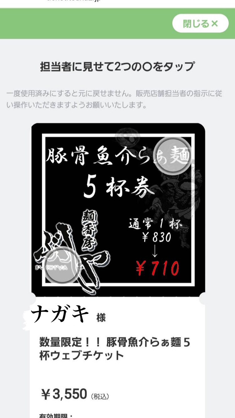「つけ麺」のウェブチケットに500pt利用した場合↓
