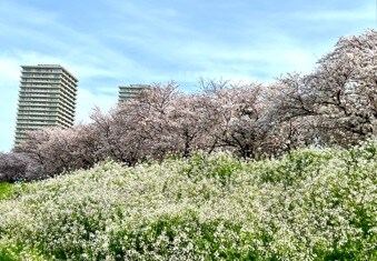 散歩コースは今、桜が満開〜散り始めにさしかかり、美しい眺めが楽しめます。