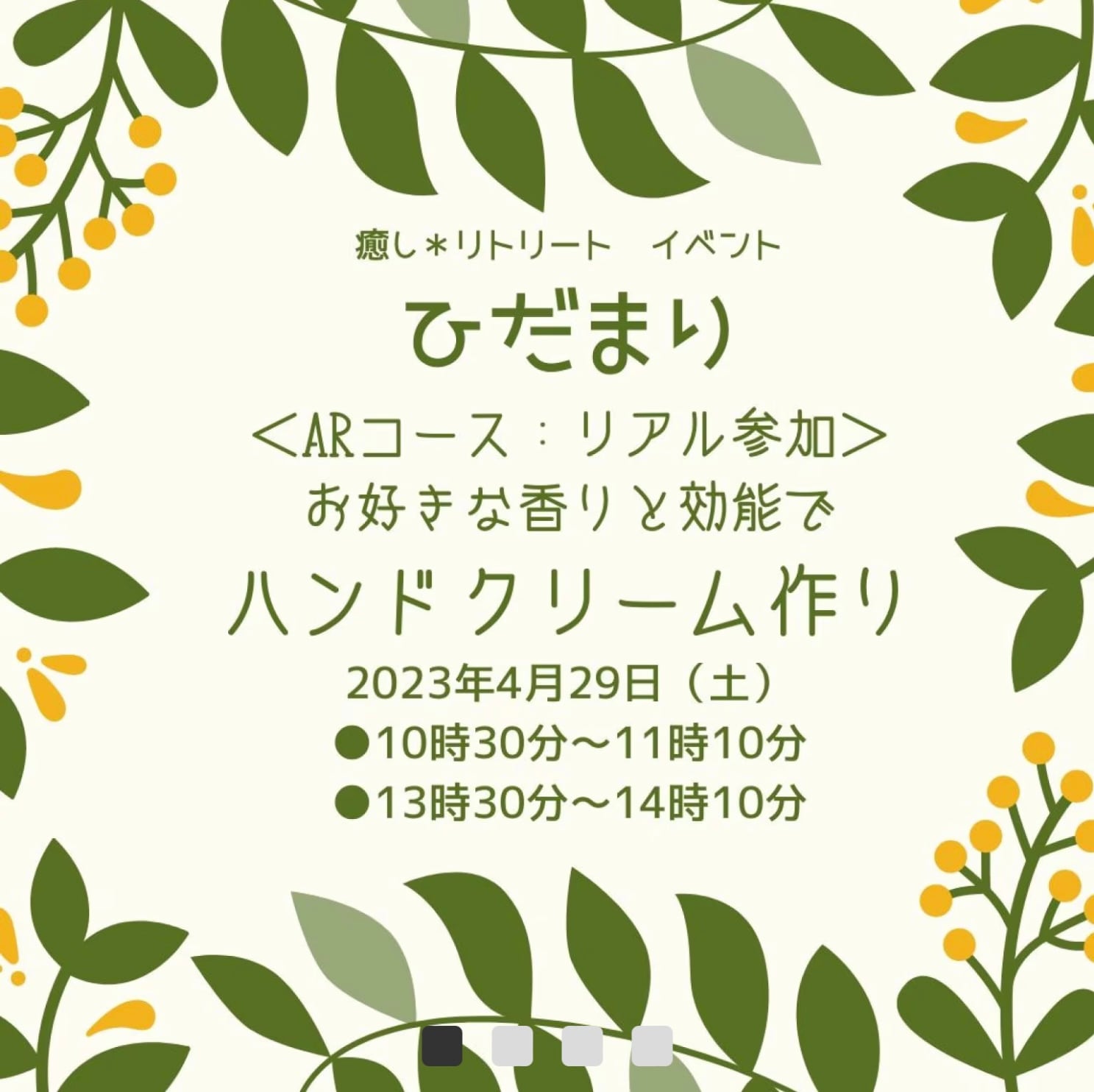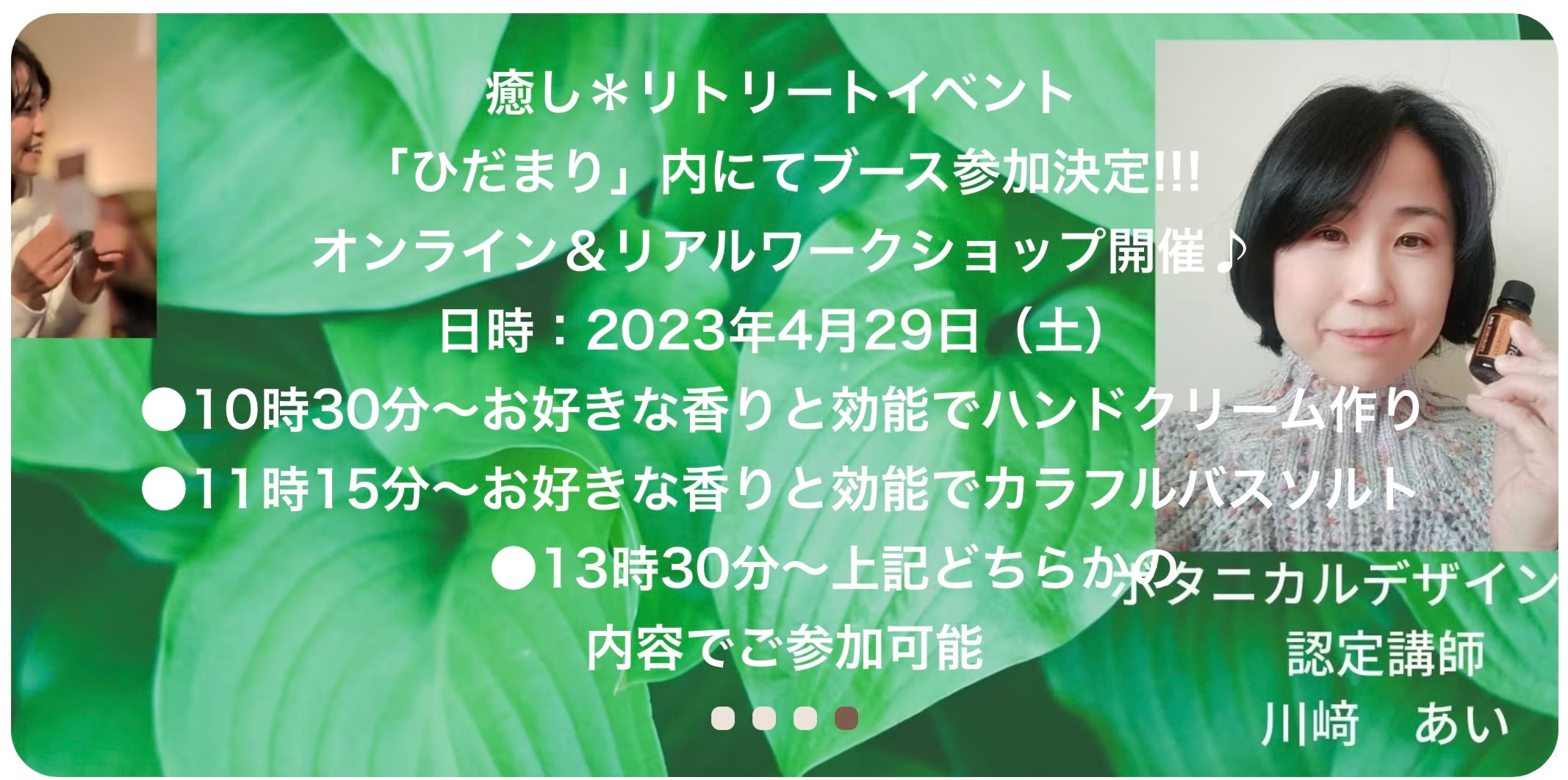 4月29日(土)10時~15時、フィオーレの森で癒しをテーマに開催される【癒し*リトリート・ひだまり】に川﨑さんが出展されます。春先は季節の変わり目だったり、新しい生活環境だったり、スギ・ヒノキ花粉だったりといつの間にか疲労が蓄積されている方も多いことでしょう。目に見える疲労ならセルフケアができますが、顕在化していなかったり我慢しがちな方にとっては、自分や大切な方に癒しとリラックスをプレゼントするにはよいタイミングですね。