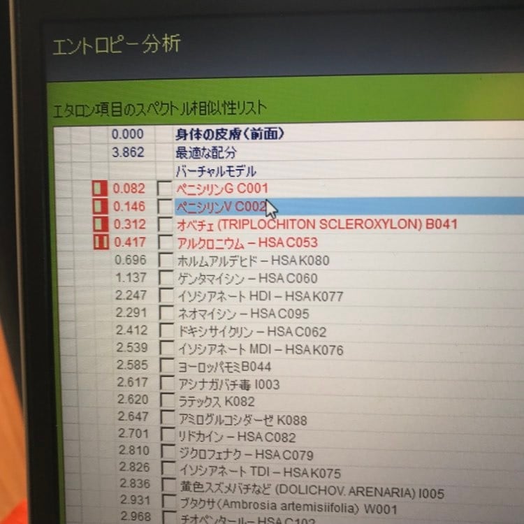 例えば、アレルギーの測定結果として以下の写真のような結果が出ます。