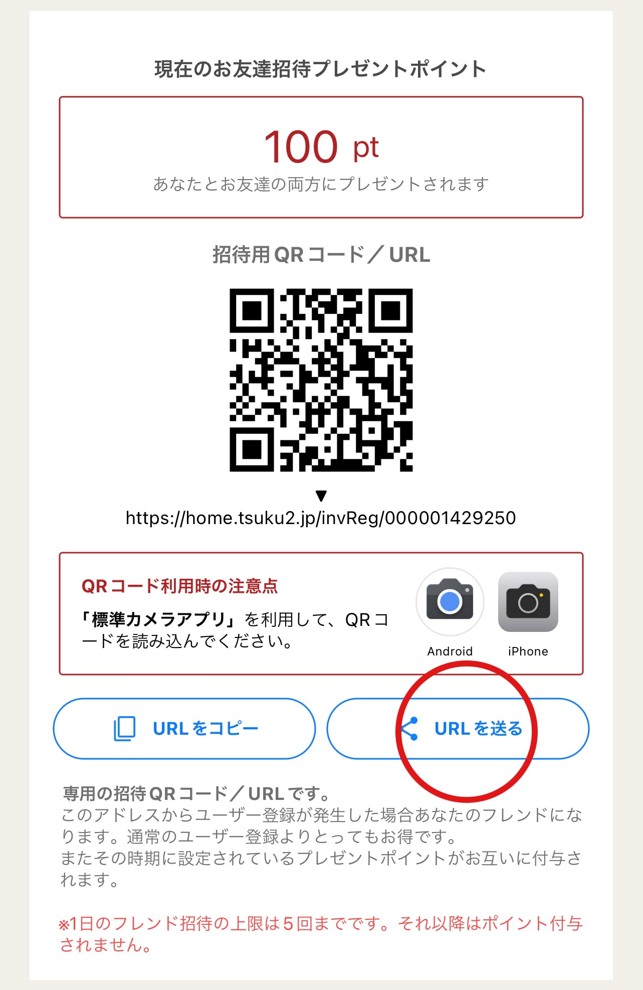 アプリのフレンド招待からLINEでお友達にURLを送ってお友達とお互い100ポイントゲットしちゃえます!