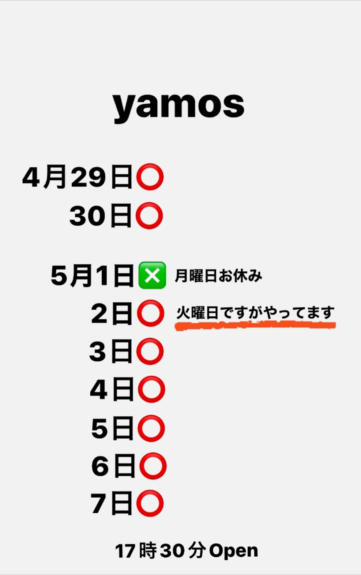 ヤモズは5月1日をお休みさせていただき、あとはぜーんぶ営業しておりす😊