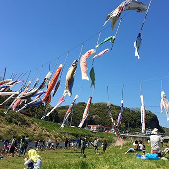 私が家族で毎年行っている場所で、たくさんの鯉のぼりが意宇川の上に吊られて泳いでいて、すご~く可愛くきれいな景色です。